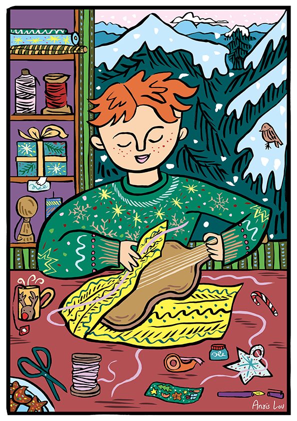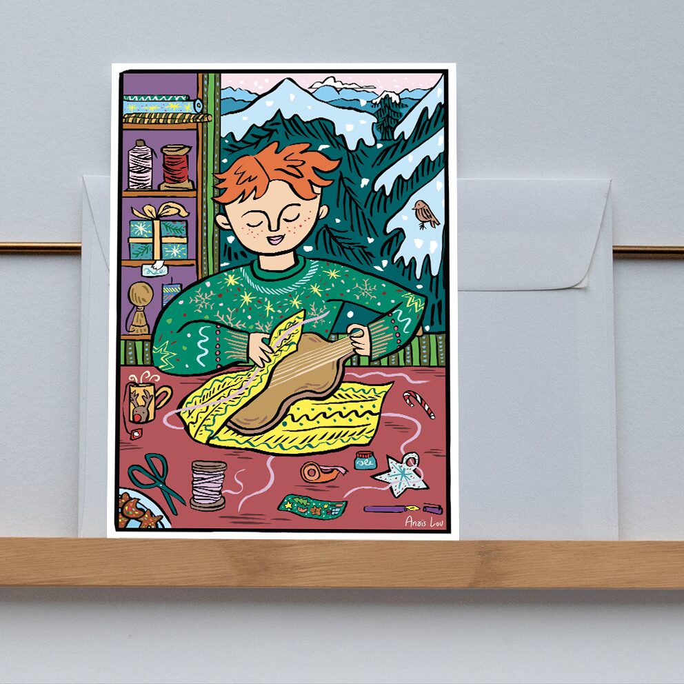 “Préparation des cadeaux” Il s’agit d’une carte postale au format A6. Recto brillant et verso mat.